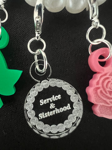 Set includes: stretchable pearl bracelet and charms: AKA, “Service & Sisterhood”, 1908, pink tea rose, and green ivy leaf  - ONLY, bonus charms available to purchase separately.