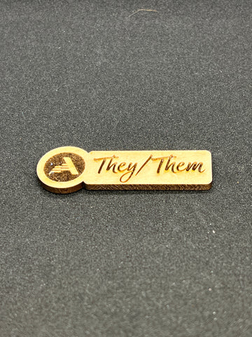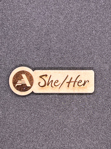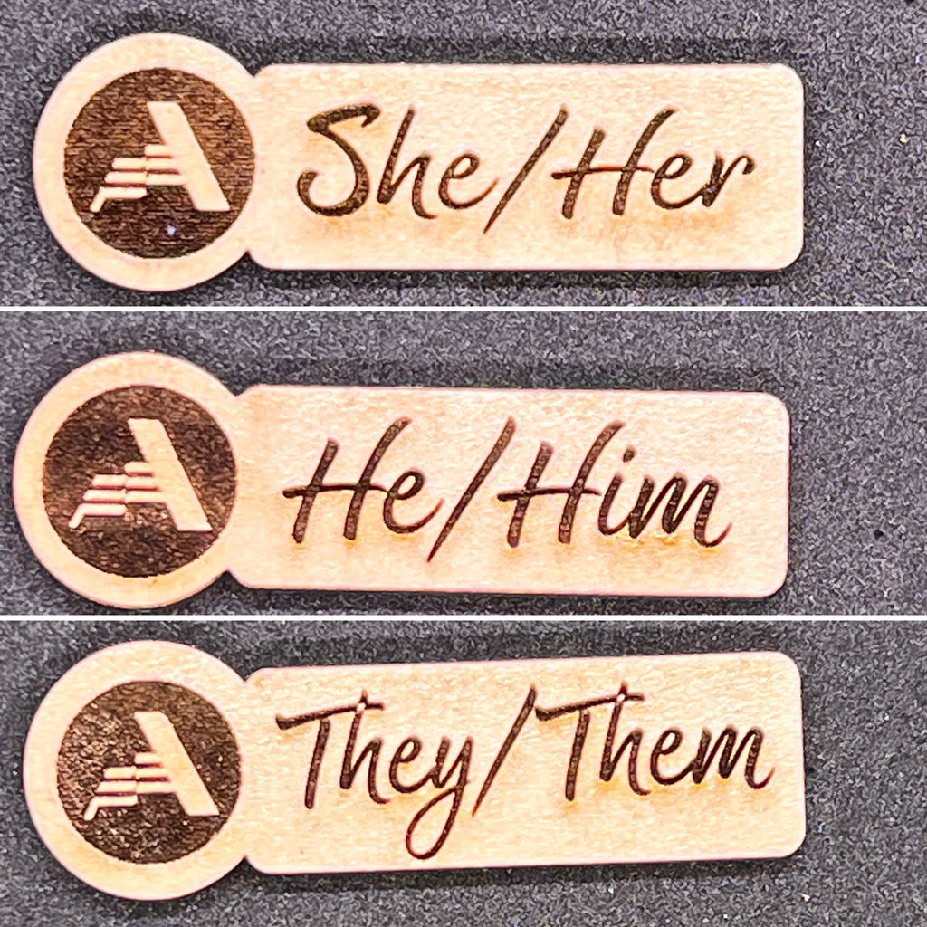 Display your “A” and pronouns with pride! Attaches easily to close or conference badges with magnetic bar backing.