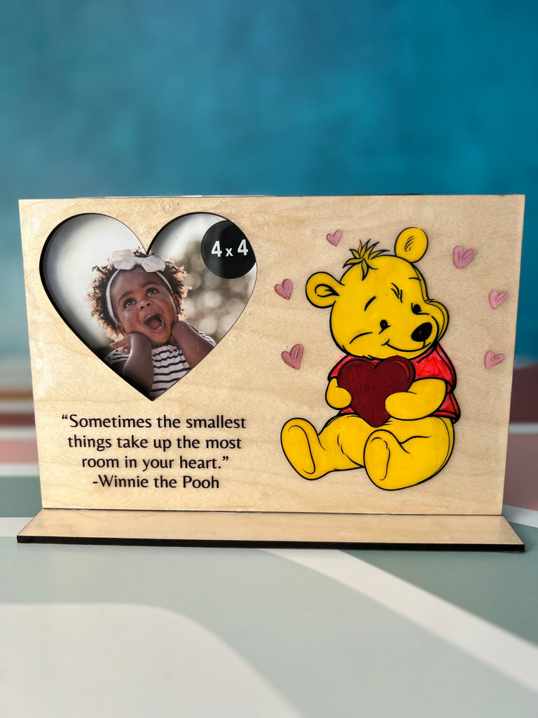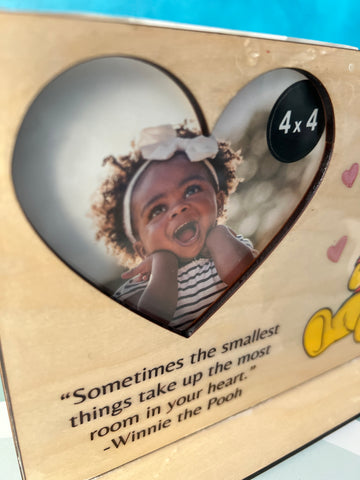 Custom photo frames can be designed in two sizes, include different photo viewer shapes, and short text. Designs can include the following options: