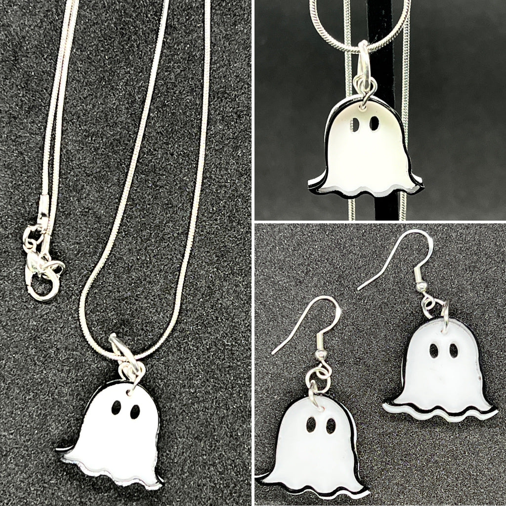 An earrings and necklace set just in time for spooky season! Available with silver plated option only. Necklace is 18” with additional 1” chain extensions.