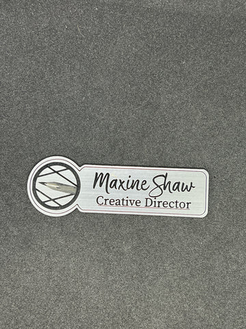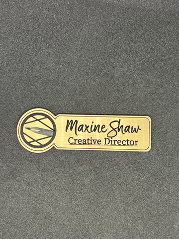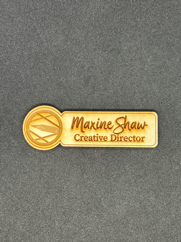 These custom wooden engraved badges include a name, title, and logo. The have a magnetic bar back so not to mess up any clothing with pinholes. **Images just for sample examples**